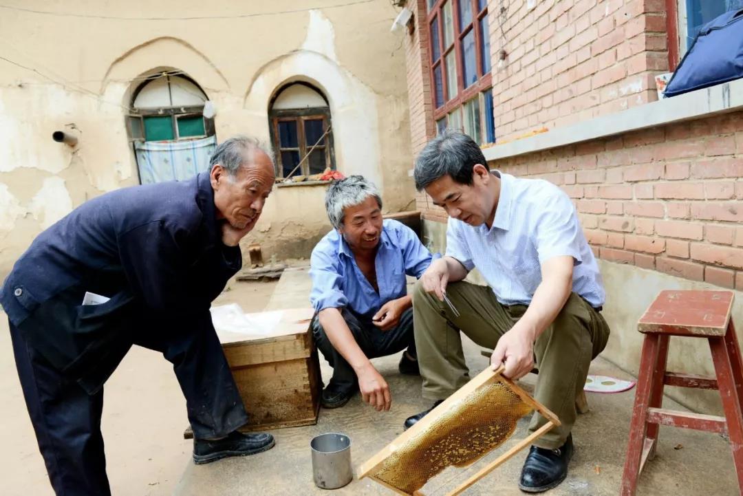 “可不是吗!近几年我们饲养蜂群由最初的40多群发展到现在的近500群,而且产出蜂蜜质量好、产量高,年收入近40多万,我们蜂农都跟吃了蜜一样,这可多亏了山西农大姜玉锁教授和他的团队多年来对我们的帮助呢!”说到这儿,兄弟俩的话匣子就打开了。“姜教授和他的团队一直致力于蜜蜂饲养管理技术的研究,从2004年来到我们沁水县助困扶贫,起初,我们还很顾虑,人家堂堂大学教授,来这里图啥?见他们又是入山进林搞调研,又是进村入户作指导,他们的言行渐渐消除了我们的顾虑。姜教授常说,蜜蜂产业被称作‘无公害的空中农业’,沁水蜜源分布广且集中,发展成熟蜜生产一定能助我们脱贫致富,让我们相信科学、相信技术。在他的帮扶指导下,我们蜂农联合起来把‘小蜜蜂’做成了‘大产业’。现在我们沁水县可是全国成熟蜜生产示范基地,中国蜜蜂之乡,洋槐蜜还是我们的地理标志产品呐!刚才,你也看到了我们产出的蜂蜜,这就是事实,所以我们信任姜教授,他让我们怎么干,我们就怎么干,这干活的劲头越来越足啊!”
